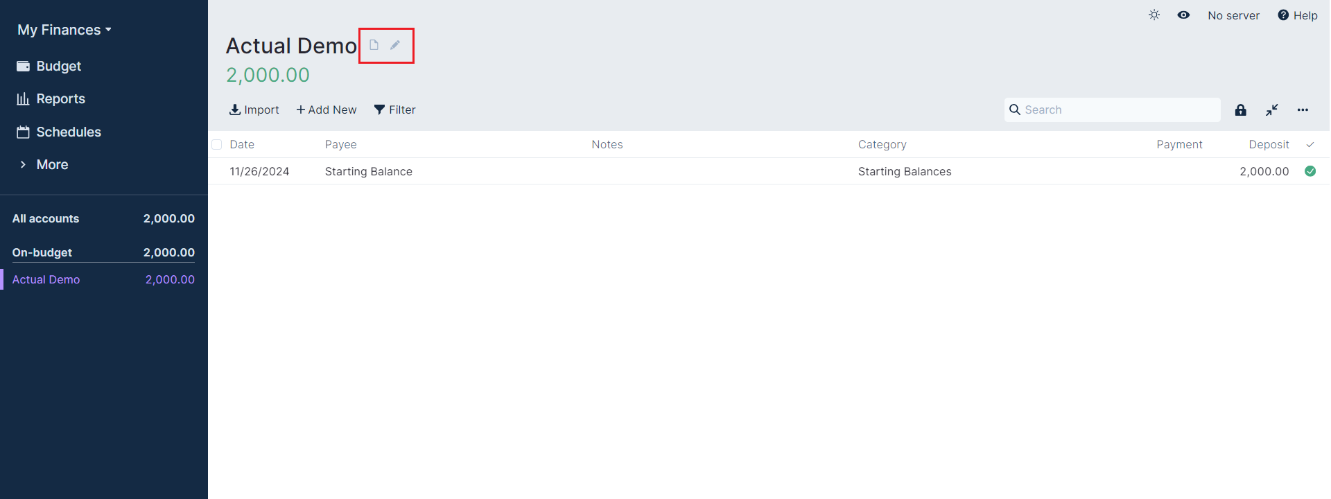 Hovering your cursor close to the account name at the top will reveal two icons. The page icon allows you to write a note about this account, and the pencil icon allows you to rename the account.