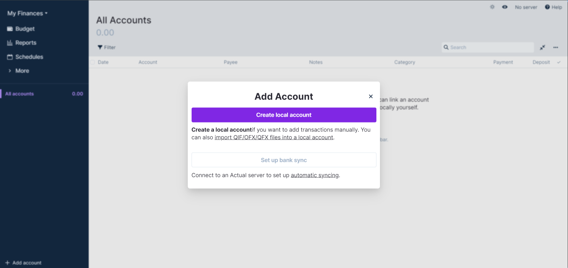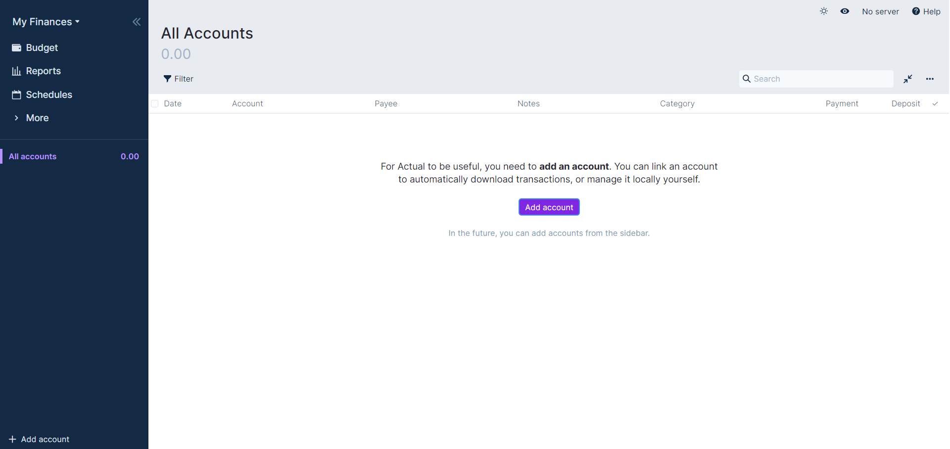 You can add an account to your budget at any time, however when you first install Actual you can use the Add Account button in the middle of the screen.