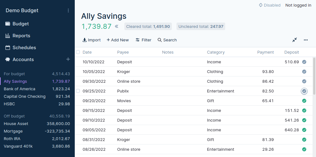 By clicking on the green balance in the header of the account view, two more category balances will come into view. The cleared total only includes transactions that have been cleared while the uncleared total will represent the transactions you have entered but may not have entered the bank statement yet.