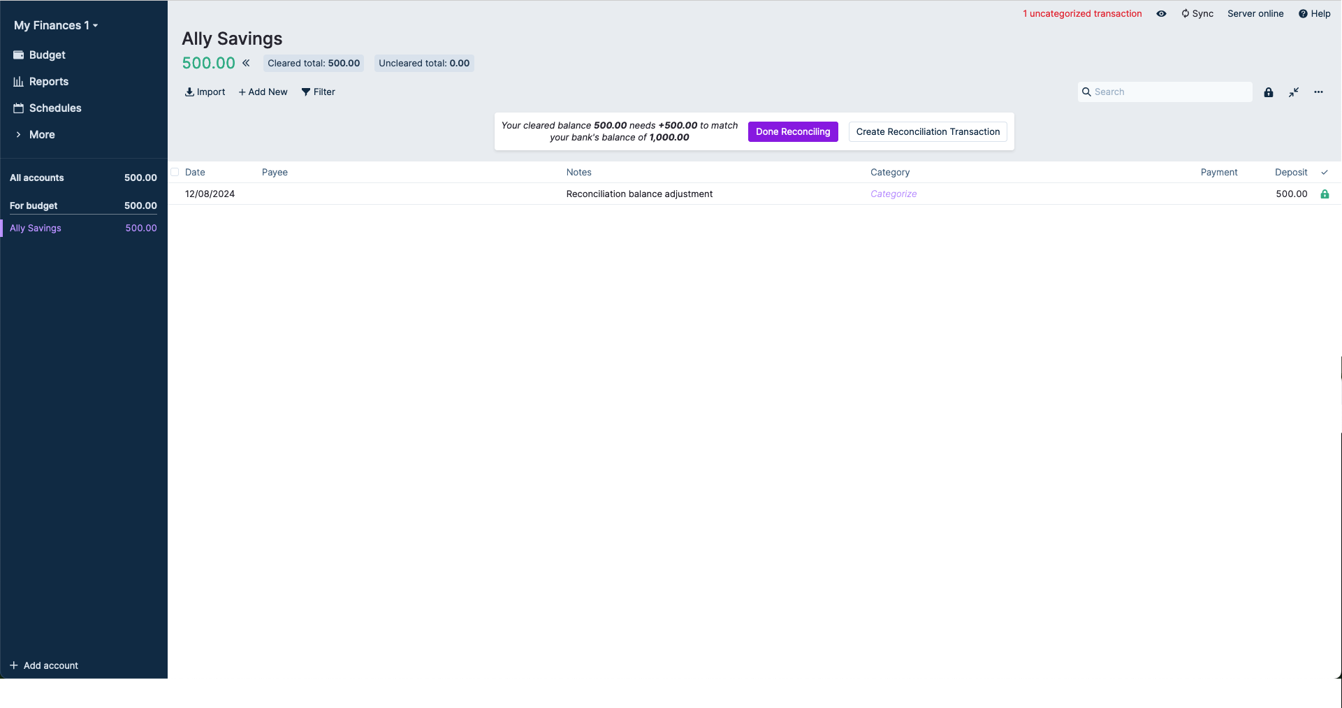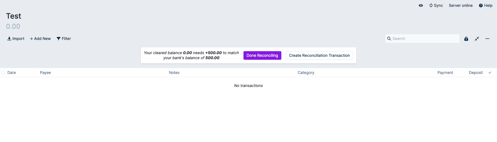 We can enter this difference into the ledger. We used Reconciliation as the payee, but you can use whatever payee you'd like. By using a payee that is not used anywhere else you can find these adjustment transactions using the search features more easily.