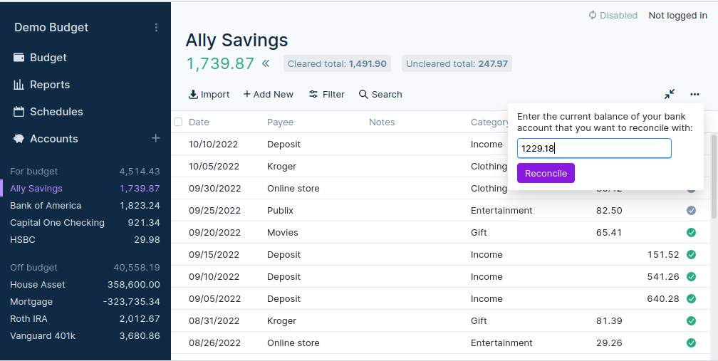 Let's imagine that we have just checked our account balance for our Ally Savings account and the current balance is $1229.18. We enter the balance we want to match into the Reconciliation tool and press Reconcile.