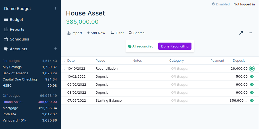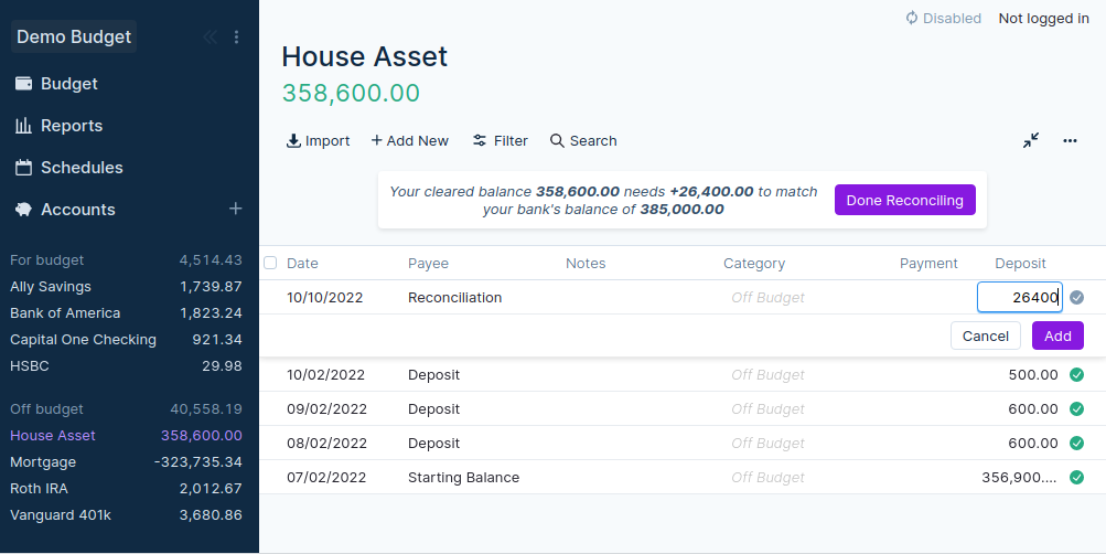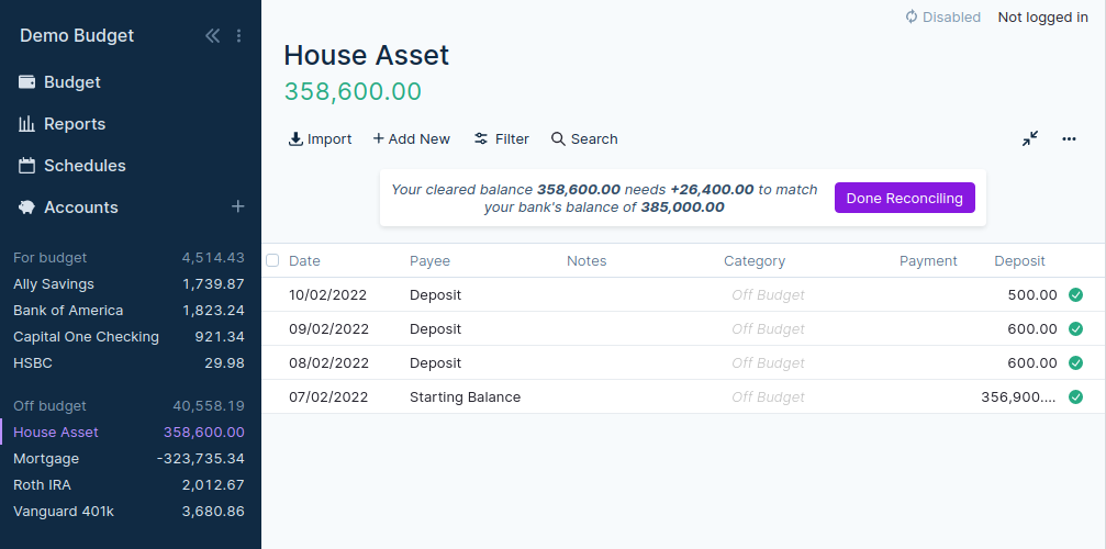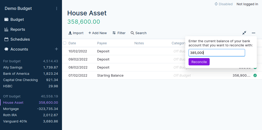 Some people use off budget accounts to track values of assets such as vehicles, real estate, retirement accounts, or other investment accounts or property. The reconciliation tool is useful to update these values as well. Let's say we have a house that was valued at 358,700 but with current changes in the market it is now valued at 385,000. We go to the ledger for the house, choose the reconciliation tool, and enter 385,000 as the new value into the tool.