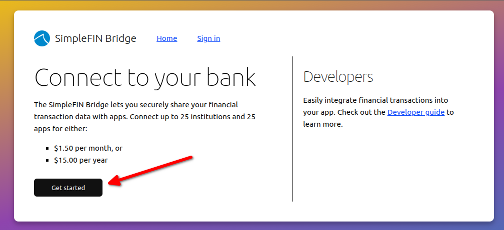 Create an account with SimpleFIN Bridge - https://beta-bridge.simplefin.org/ , by clicking "Get Started" and entering your email address.