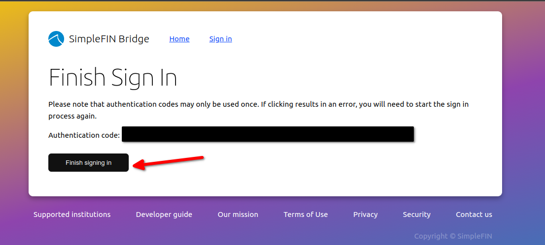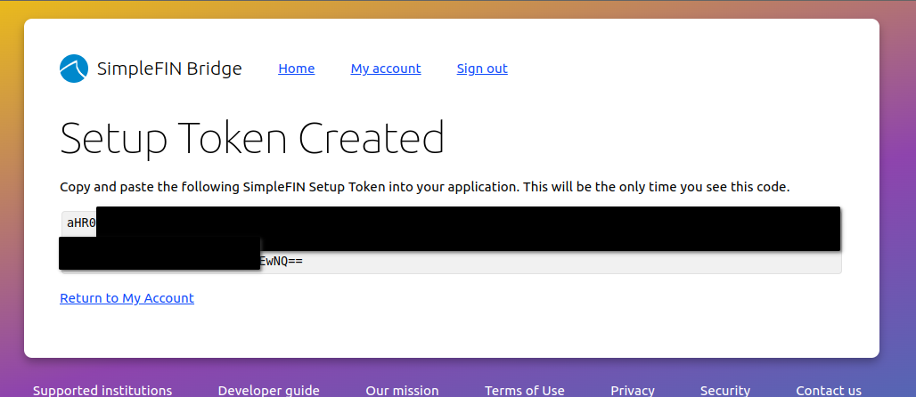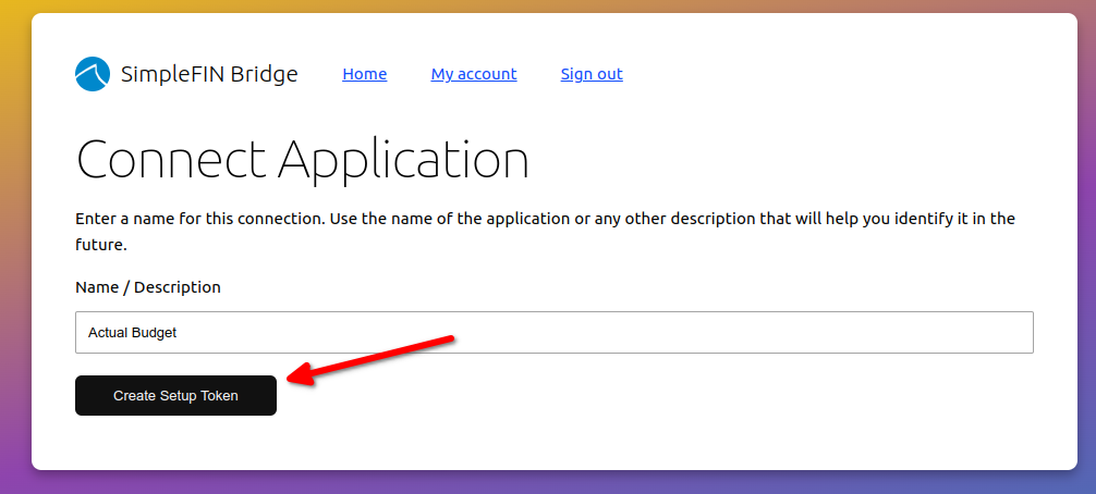 You will be asked to enter your SimpleFIN setup token. The keys from this value will be saved on the server, so you will only need to enter it once.