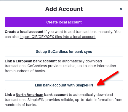 Click “Link bank account with SimpleFIN”.