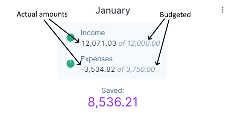When a new month begins, your Projected Savings changes to Saved or Overspent, depending on your final transactions. The final savings amount calculated for this field is your actual income minus your actual expenses. If you hover your mouse over the Saved or Overspent text, you can view the breakdown of projected and actual savings for the month.