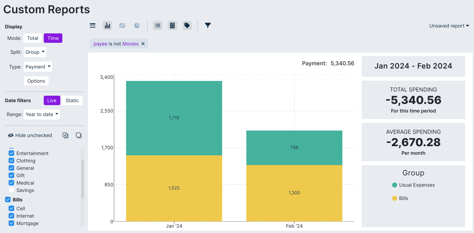 Custom Reports are really powerful and can provide unique insights. We now highlight a complex example that uses most features. Our goal is to have a stacked bar chart broken down by group with month on X axis, in a certain time frame, excluding a certain category and payee.
