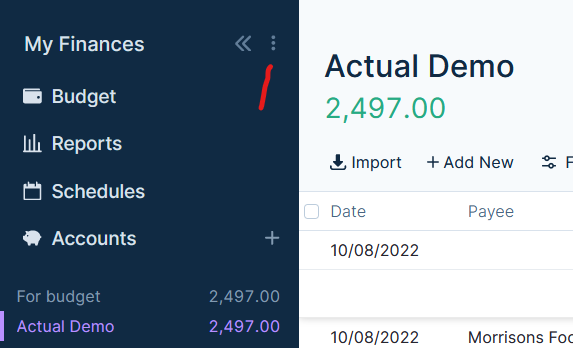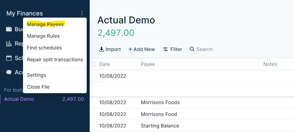 To manage payees, either select the More > Payees from the sidebar or click the Manage Payees button when editing a transaction's payee.